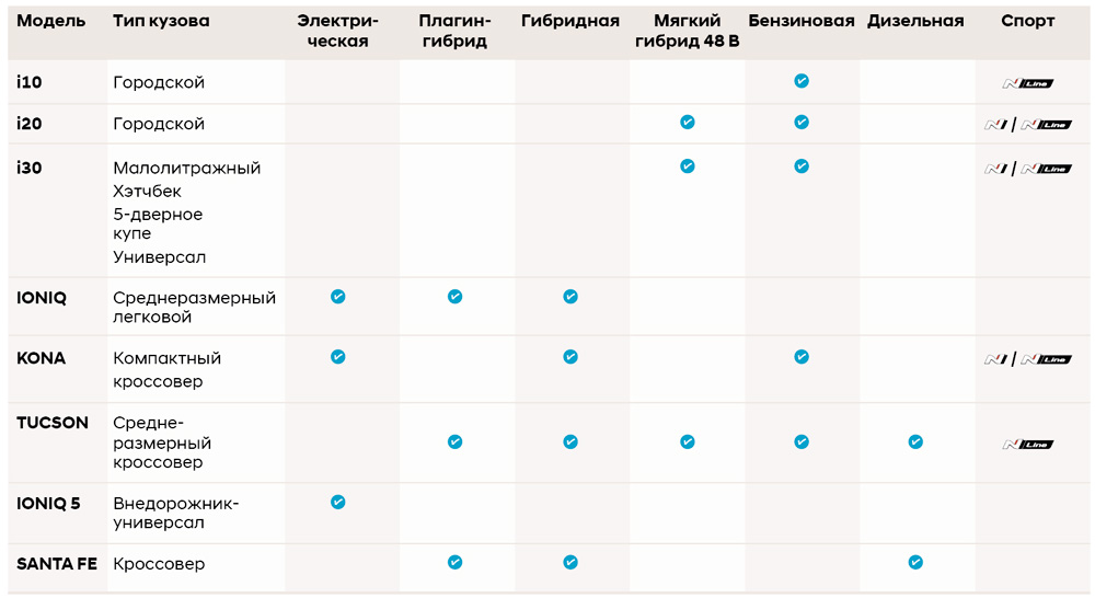 Сегодня Hyundai предлагает самый широкий на рынке ассортимент силовых агрегатов – от бензиновых и дизельных двигателей внутреннего сгорания до электрифицированных гибридных, плагин-гибридов, электрических и водородных двигателей.
